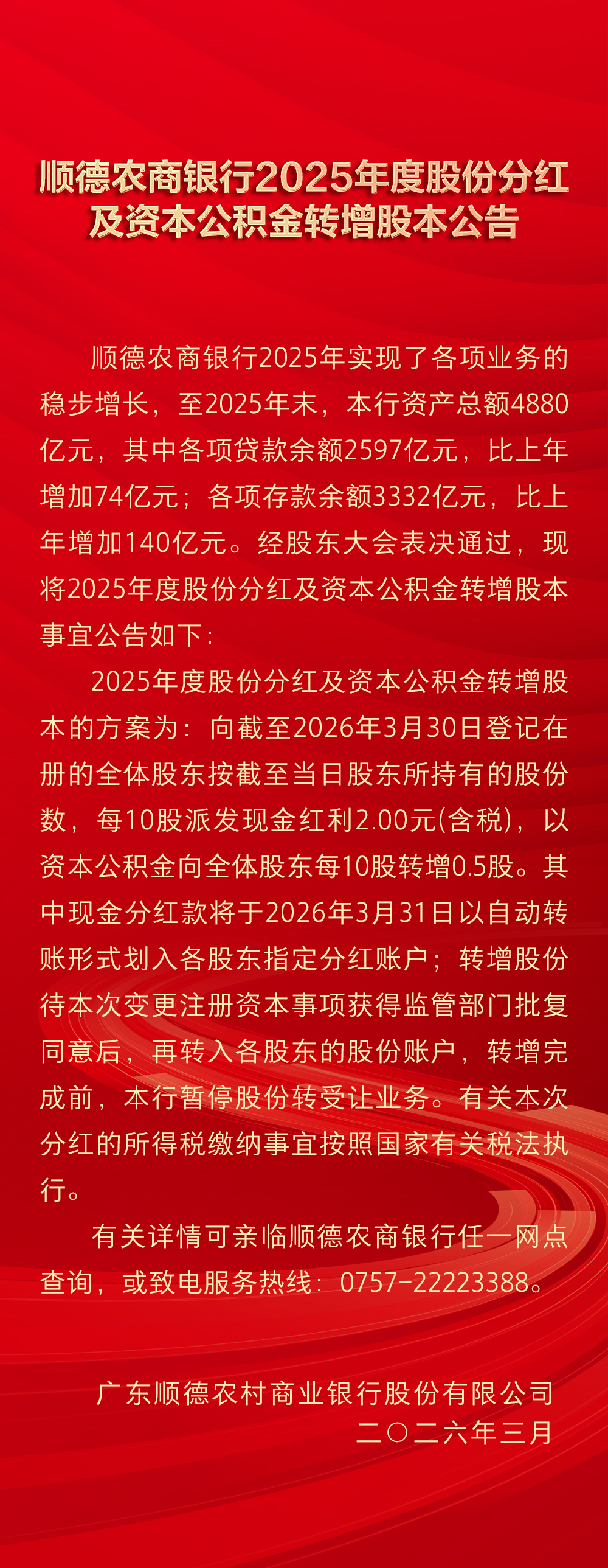 顺德农商银行2025年度股份分红及资本公积金转增股本公告
