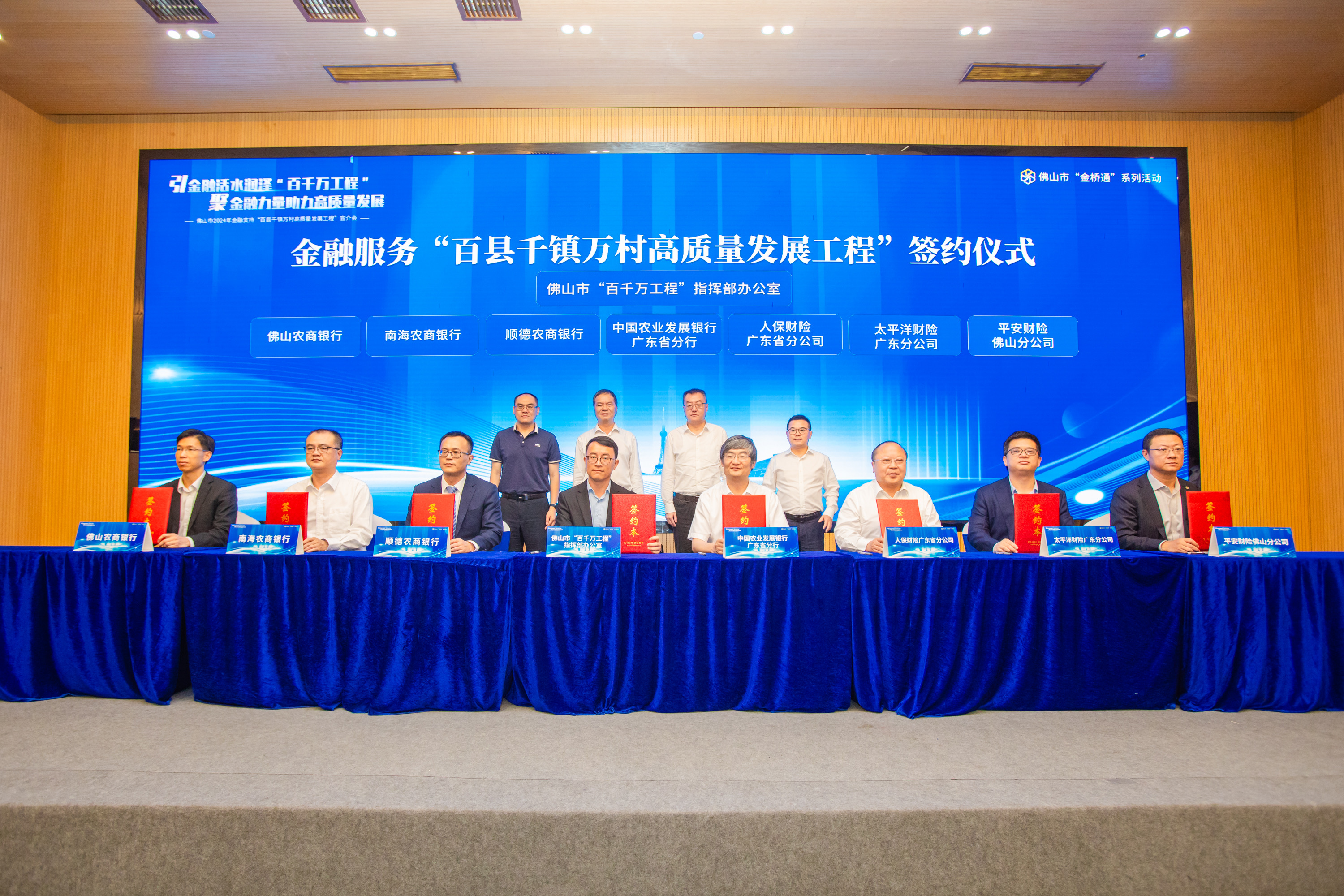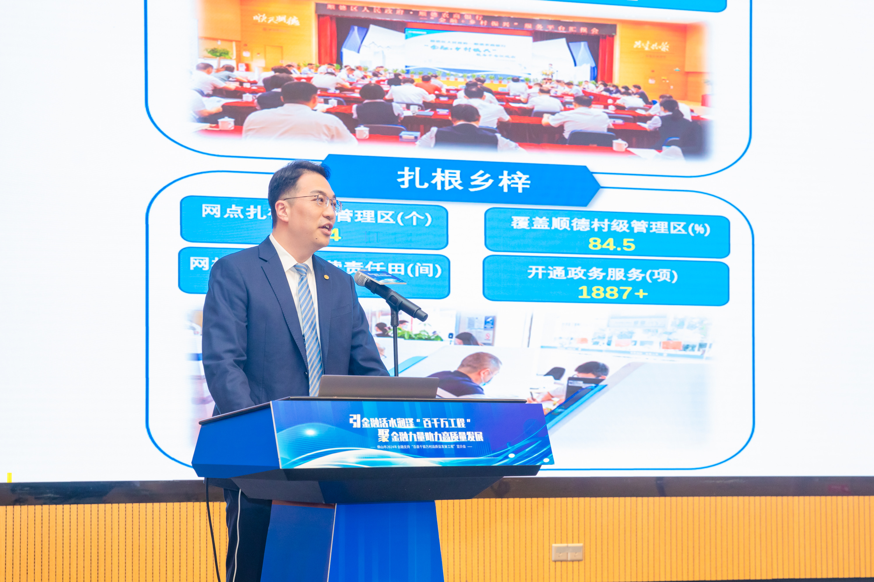 为全面落实省、市关于实施“百县千镇万村高质量发展工程”的决策部署,2024年4月9日下午,佛山市金融工作局、佛山市农业农村局、佛山市“百千万工程”指挥部办公室在文华花市指挥中心联合举办了金融支持“百县千镇万村高质量发展工程”宣介会。本次会议以“党建+金融”助力“百千万工程”为出发点,引领金融资源下沉镇街。作为中小金融机构代表之一,顺德农商银行党委副书记王磊、总行公司银行部总经理张弛、总行战略发展部总经理潘建峰、龙江支行行长周敏全作为我行代表出席了本次宣介会。