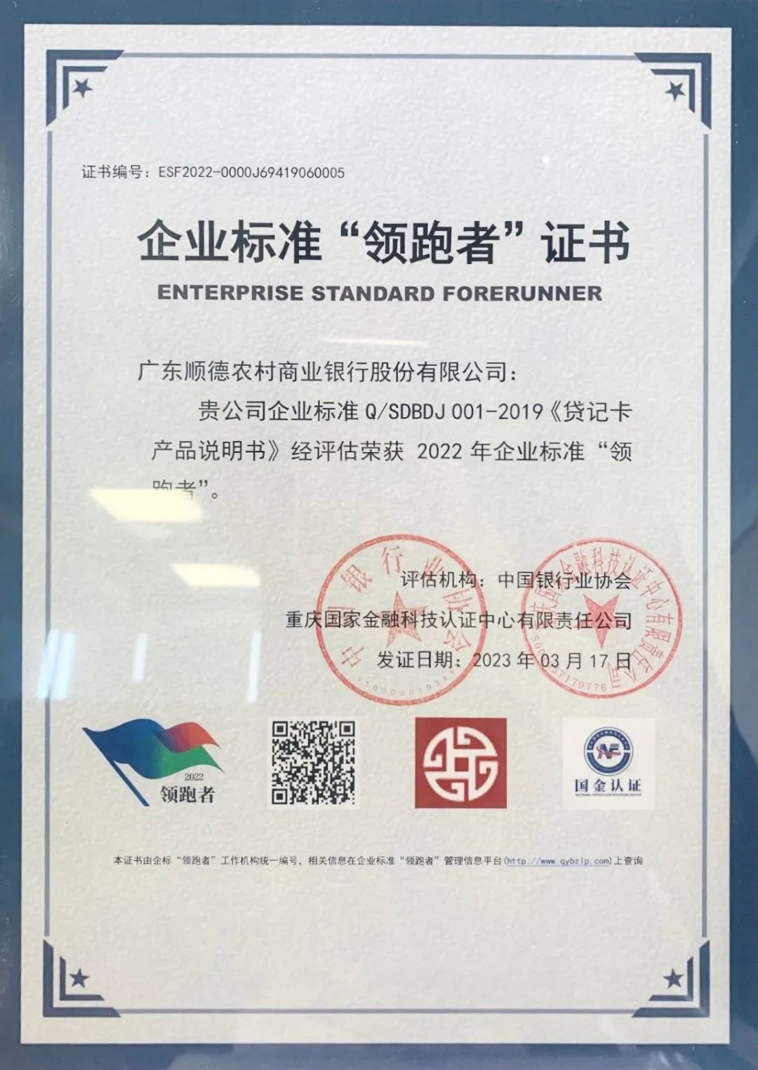 在国家市场监督管理总局支持下,中国人民银行联合银保监会、证监会持续组织开展金融领域企业标准“领跑者”活动。重庆国家金融科技认证中心和中国银行业协会负责2022年度金融信息服务领域金融产品信息资讯服务企业标准“领跑者”的评估工作。经初审、复审、评选和公示通过,2022年度,共有7家银行获得金融产品信息资讯服务企业标准“领跑者”称号,我行蝉联3次入选,且是唯一一家获奖的农村商业银行。