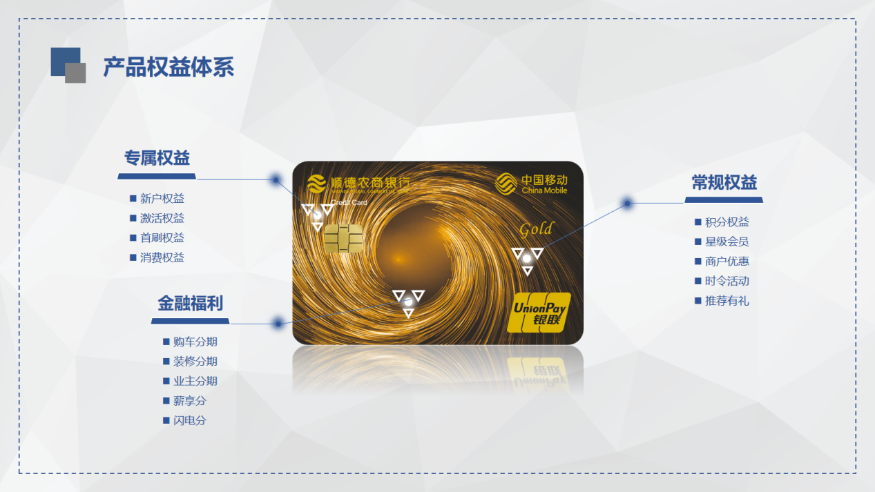 据悉,此次发布的顺德农商银行“移动LOGO信用卡”产品,是顺德农商银行与佛山移动基于党建和创友好合作的基础上携手推出的5G+金融惠民服务。“移动LOGO信用卡”是双方集优势资源,联合打造的跨界信用卡产品。该产品卡面以光纤作为设计主元素,采用珠光、烫印、镭射等工艺,时尚且科技感十足。同时,产品还配置了专属权益、常规权益、金融福利三大权益体系。