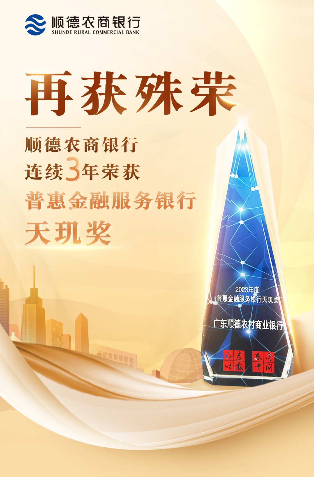 2023年7月14日,由《证券时报》主办的“2023中国金融机构年度峰会暨2023年中国银行业年会”在深圳举行,顺德农商银行普惠金融服务以突出的业绩、优质的服务与丰富的产品,获得评审专家与广大市民的好评,再度蝉联“2023年度普惠金融服务银行天玑奖”,这是我行连续三年获此殊荣。
