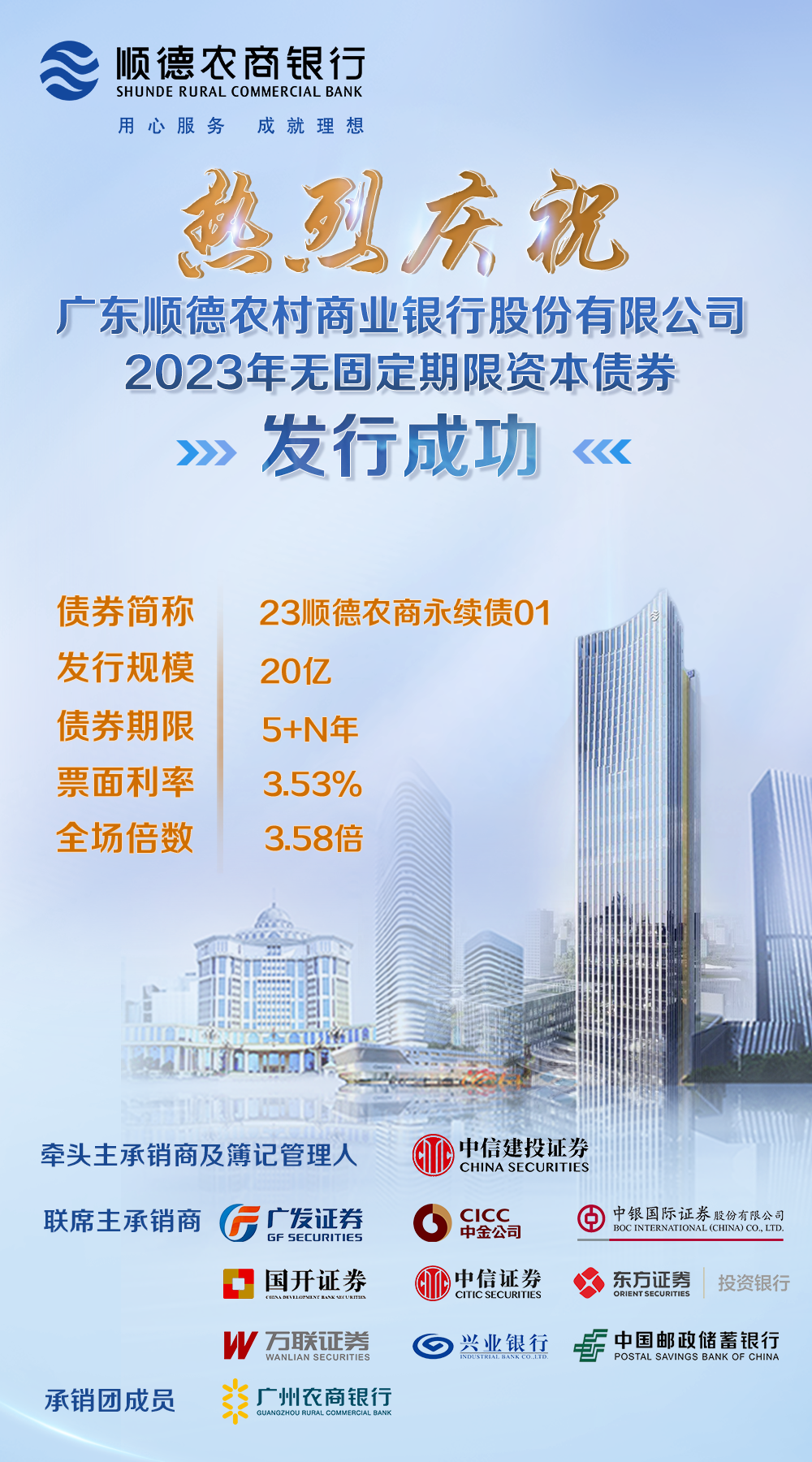 2023年12月15日,顺德农商银行首只无固定期限资本债券(永续债)顺利发行,债券简称:23顺德农商永续债01,债券代码:242380036。本期债券发行规模为20亿元,票面利率3.53%,期限为5+N年期,全场倍数为3.58倍。