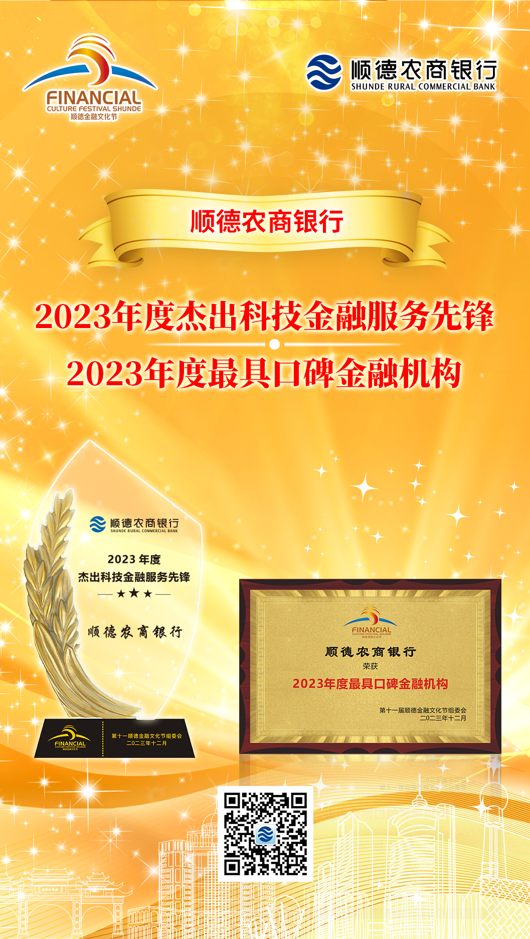 12月22日,“2023顺德金融品牌榜”正式揭晓。顺德农商银行荣获“2023年度最具口碑金融机构”、“2023年度杰出科技金融服务先锋”。
