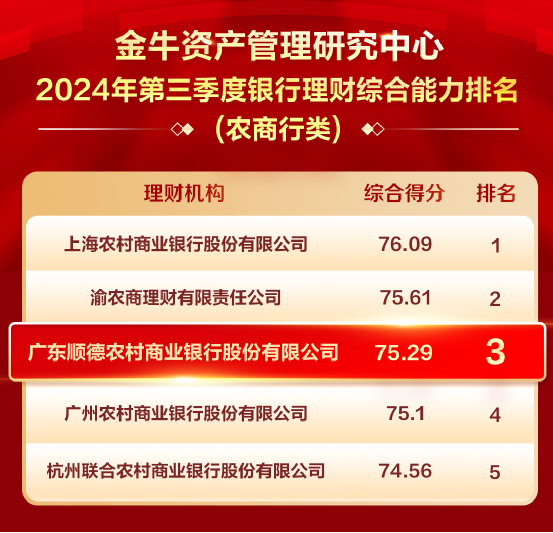 在金牛银行理财评价体系2024年第三季度银行理财综合能力排名结果中,广东顺德农村商业银行位列农商行类理财机构前三。本行已连续两个季度位列农商行类理财机构排行榜前三位。