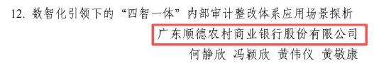 顺德农商银行审计工作深入贯彻落实上级金融政策方针和审计工作要求,在总行党委的正确领导下,紧扣数智化发展新趋势,坚持研审结合、以研促审,以“科学规范提升”为目标,积极探索审计数智化实践路径,推动提升审计监督质效。2025年,顺德农商银行基于实践研究形成的论文《数智化引领下的“四智一体”内部审计整改体系应用场景探析》在中国内部审计协会开展的内部审计理论研讨活动中脱颖而出,荣获全国第12名的优异成绩(位居全国农商行之首、全国银行业排名第二),获得中国内部审计协会2025年度总结大会的公开表扬。