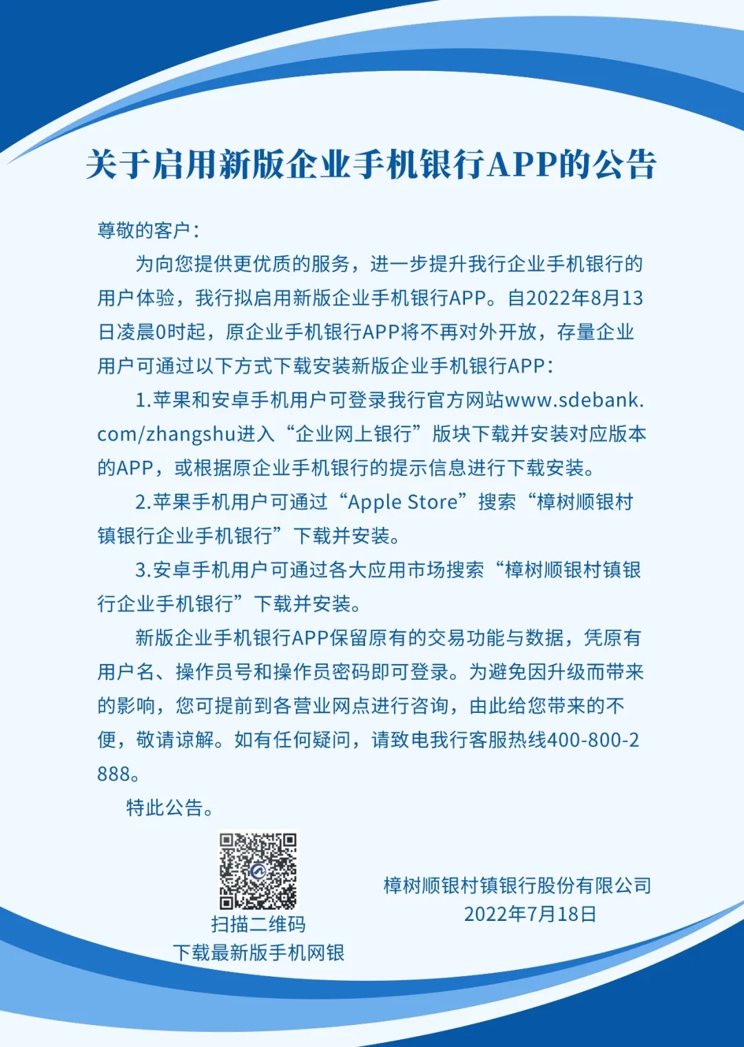 关于启用新版企业手机银行APP的公告
